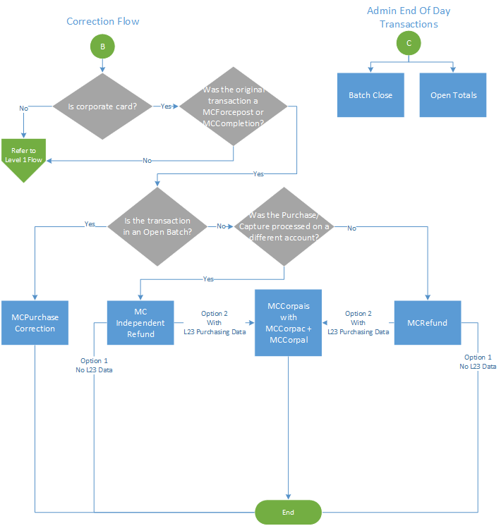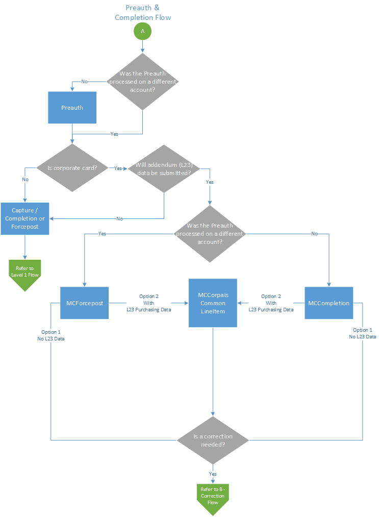 Note: Refer to CorporateCard being returned within the response to determine the next transaction. If the value is”true” proceed with MC Completion. If false, return to Non-Level 2/3 Transactions.